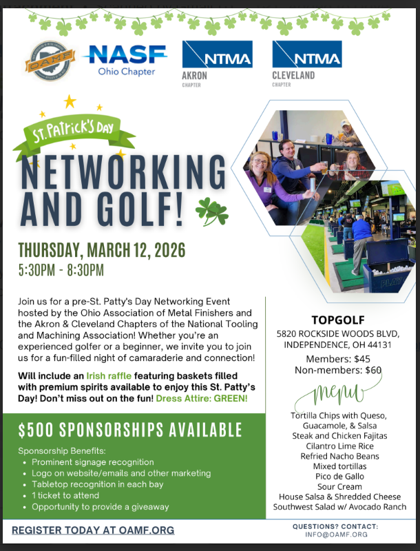 Celebrate the season with the Ohio Association of Metal Finishers! Enjoy a festive evening featuring a delicious meal, great conversation, and the chance to connect with fellow OAMF members and friends. Don’t miss this special opportunity to relax, network, and toast to the holidays together.